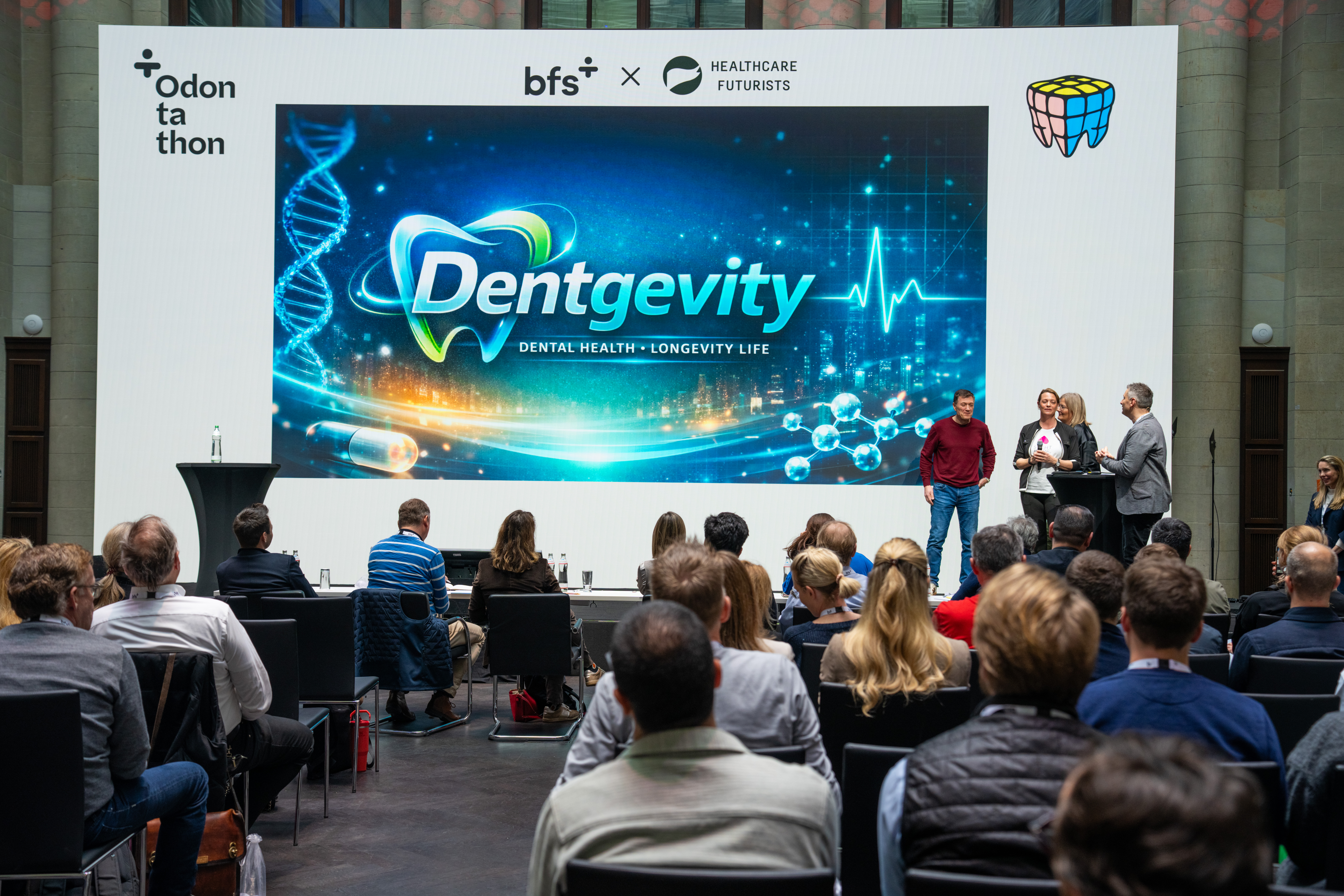 Die Pressegruppe mischte sich direkt unter die zahlreichen Odontathon-Teilnehmerinnen und -Teilnehmer, um sich bei der Begrüßung durch die Führungsriege von bfs und die Vorstellung der zukunftsorientierten Challenges vom Innovations-Spirit anstecken zu lassen. Es galt direkt die herzliche Einladung an alle Pressevertreterinnen und -vertreter, zu den Arbeitsgruppen dazuzustoßen, die sich auf Basis der Challenges zusammengefunden hatten, um sich ein Bild von der Innovationskraft des Events zu machen. Challenge-Themen waren u.a. ‚Community Plattform für digitalaffine Zahnärztinnen‘, ‚Concierge Cooperative – keine Angst vor KI‘ oder ‚Longevity Zahnmedizin‘.